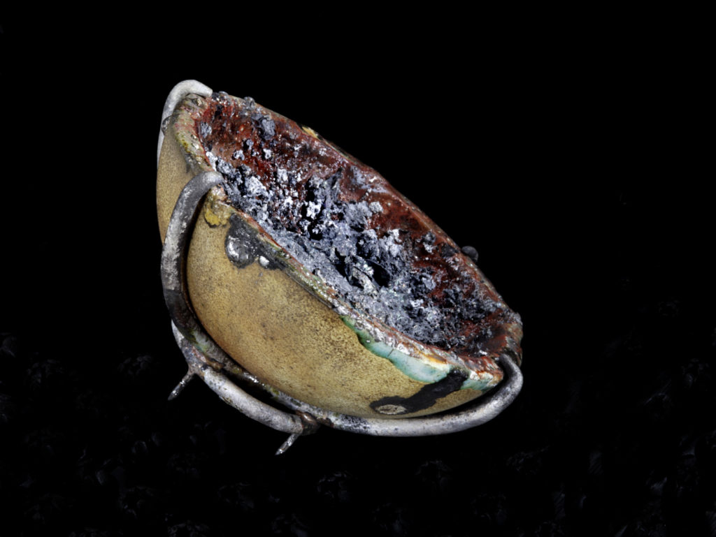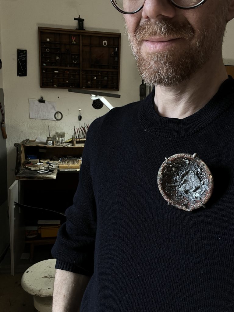 Crucibles and failure are key elements of jewellery making. So I transformed a failed attempt to melt an aluminium alliage which ruined my crucible, into a brooch.