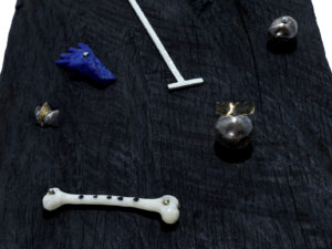 Cette broche s’inspire de la lame n° 13 du tarot, qui résonne avec une étape de transformation personnelle. Elle crée un dialogue inattendu avec un Proverbe de l’Enfer de William Blake, révélant les tensions entre destruction et renaissance, thèmes centraux de l’œuvre. Les matériaux proviennent de l’atelier de l’artiste et portent la trace du temps : ivoire ancien, ébène brûlé pour représenter le sol, perles brûlées pour les têtes, corail et turquoise formant à la fois la colonne vertébrale et le ver coupé. Ce croisement entre le proverbe et la lame ne se limite pas au texte gravé sur le bois : il s’illustre également dans la colonne vertébrale au nœud rouge, qui devient visuellement le ver coupé en deux. La pièce combine des matériaux nobles, comme l’or, et plus modestes, tels que le stylo, assemblés par soudure et collage. La flûte en os introduit une dimension sonore et symbolique, s’inscrivant dans le jeu de transformation. L’œuvre propose une double lecture : une perspective frontale dévoile le texte, la faux, le ver, la main et la flûte, tandis que la perspective « à ras du sol » met en avant le crâne, le végétal et les têtes, soulignant la dualité de la lame et du proverbe, entre destruction et régénération. La juxtaposition de matériaux anciens et contemporains renforce la dimension mémorielle et politique de l’œuvre, où chaque geste de transformation révèle la fragilité et la force de ce qui est porté.