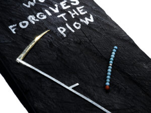 The piece combines precious materials, such as gold, with more modest ones, such as the marker, assembled through soldering and gluing. The bone flute introduces a sonic and symbolic dimension, contributing to the theme of transformation. The work offers a dual reading: a frontal perspective reveals the text, the scythe, the worm, the hand, and the flute, while a “ground-level” perspective emphasises the skull, vegetation, and heads, highlighting the duality of the card and the proverb between destruction and regeneration. The juxtaposition of vintage and contemporary materials reinforces the work’s memorial and political dimension, where each act of transformation exposes both the fragility and the strength of what is carried.