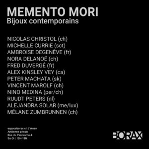 Memento Mori / Nicolas Christol, Michelle Currie, Ambroise Degenève, Nora Delanoë, Fred Duvergé, Alex Kinsley Vey, Peter Machata, Vincent Marolf, Nino Medina, Ruudt Peters, Alejandra Solar, Mélane Zumbrunnen / les 4 et 5, 11 et 12, 18 et 19 décembre 2021 www.espaceborax.ch
