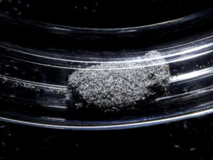 Verre borosilicate soufflé, lingot d’or suisse d’un gramme réduit en poudre, 2 grammes de mercure