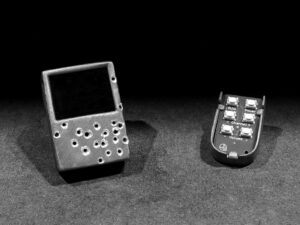 Patinated silver, video screen, remote.