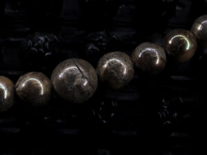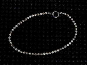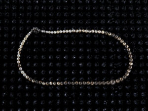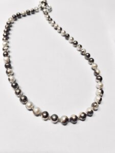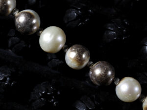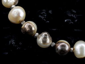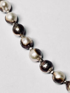 A series of necklaces composed of partially burned cultured pearls and antique silver beads.