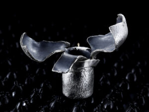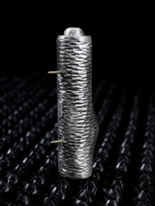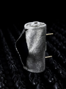 CSS-STCS (2025) is part of Transmutations, a series I made in 2025, examining the central role of gunpowder in capitalism. Its impact on the colonial project was decisive, enabling invasions, resource extraction, and the suppression of resistance. Later, techniques derived from this history, including so-called “less-lethal” methods, were imported back to Europe to control and repress social movements.The brooches and rings of this series are produced through explosion and named after different models of sting grenades. The deformation of the silver containers materializes state violence, while the gold pins form an invisible link between the device and the body: gold is not the value but the structural condition. Transmutation is not an symbolic elevation of the soul but a concrete dark process, turning bodies and nature into wealth through pure chemical violence.