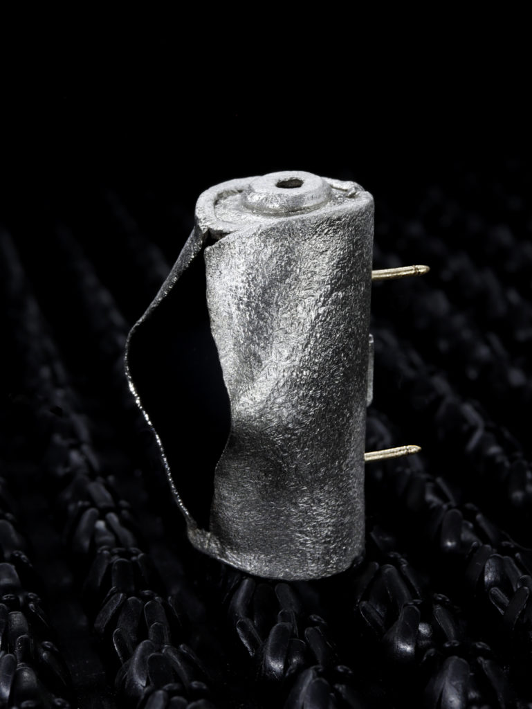 Here, black powder made it possible to blow apart silver cylinders, materializing this social violence, inherited from colonial violence symbolized by the small gold elements.