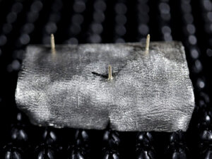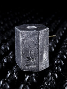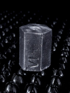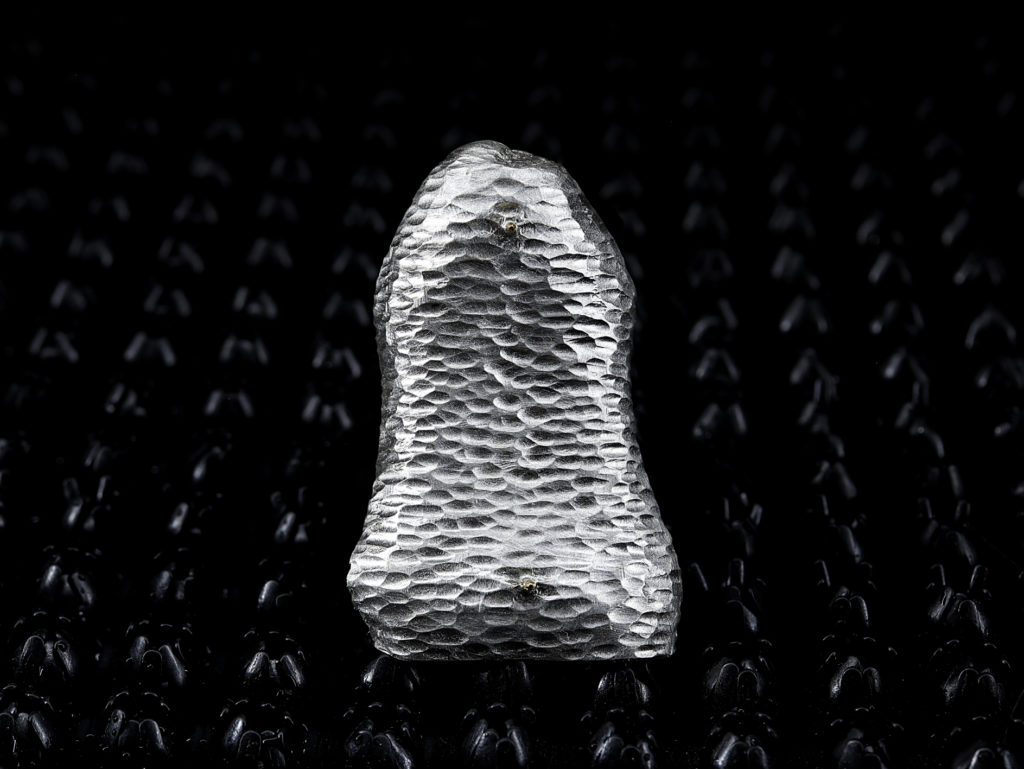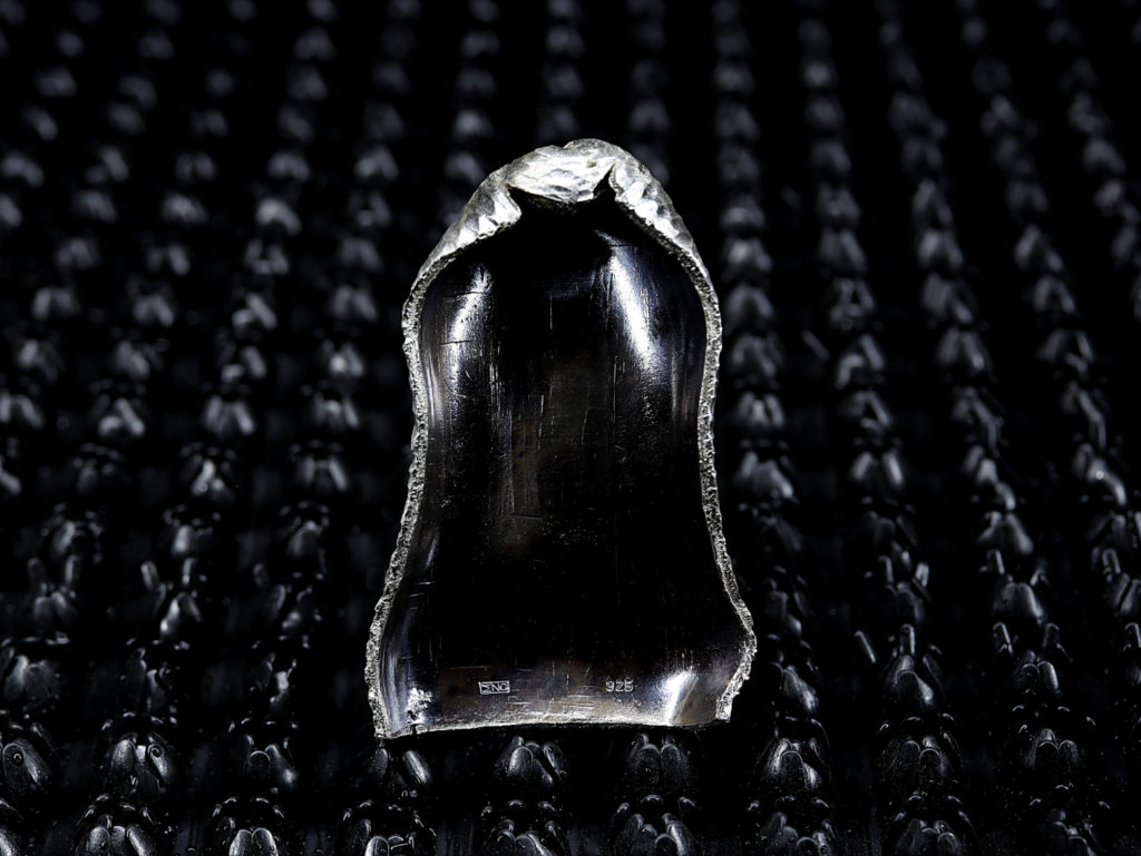 Ici la poudre noire a permis de faire exploser des cylindres d’argent, matérialisant cette violence sociale, héritée de la violence coloniale symbolisée par les petits éléments en or. Ces éclatements rappellent aussi les innombrables luttes qui ont renversé des régimes de pouvoir apparemment inébranlables, et interrogent la nécessité de la légitime-défense face à la violence d’Etat.